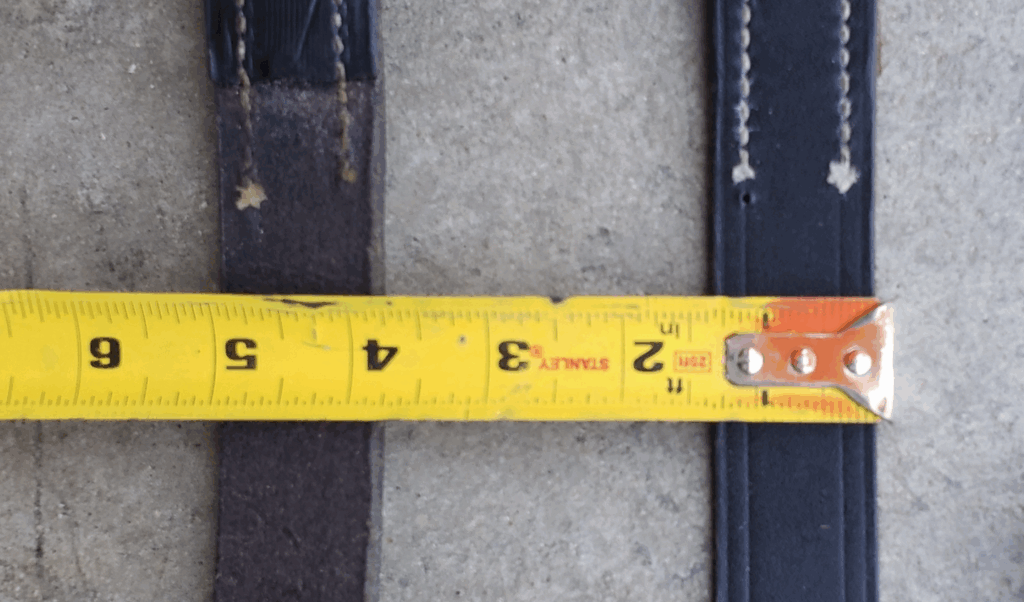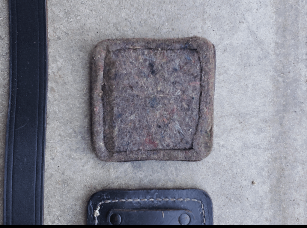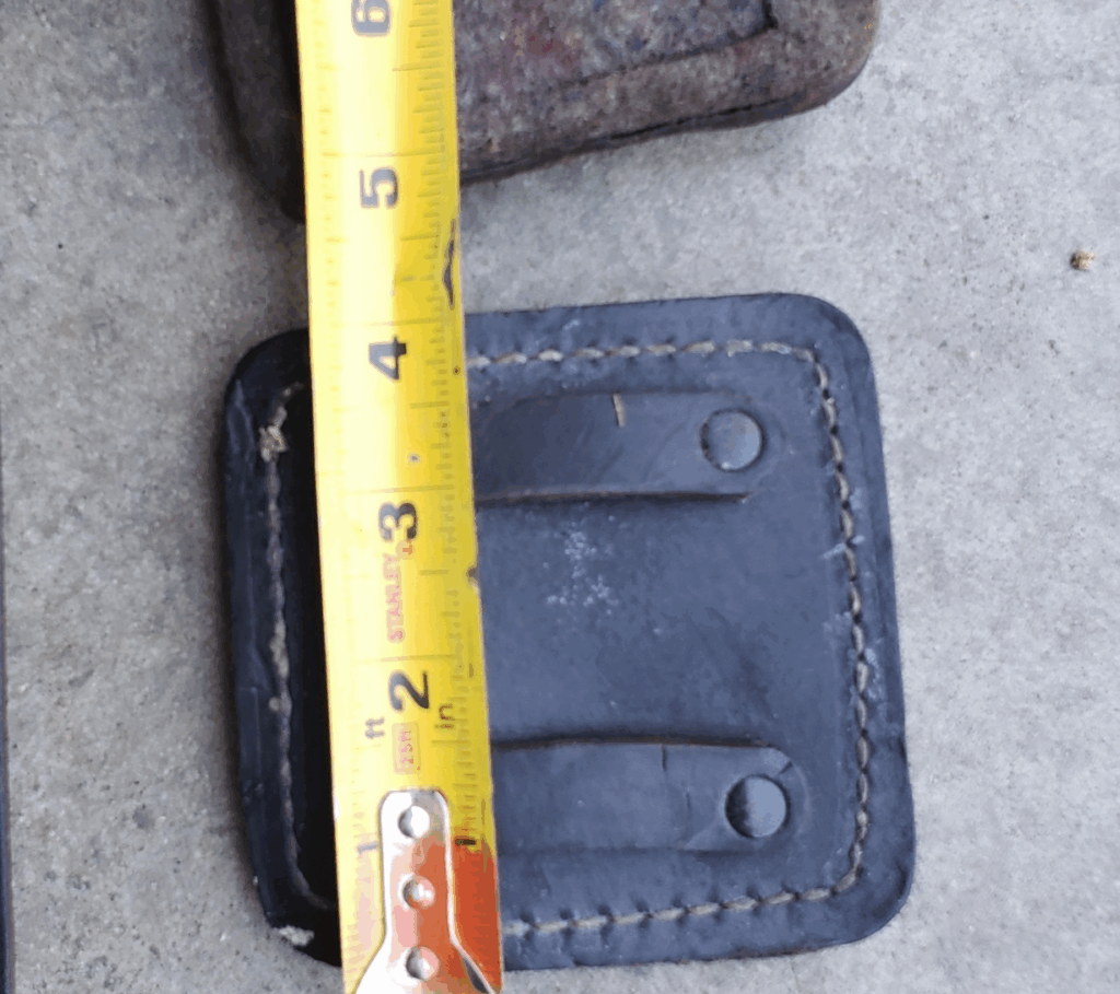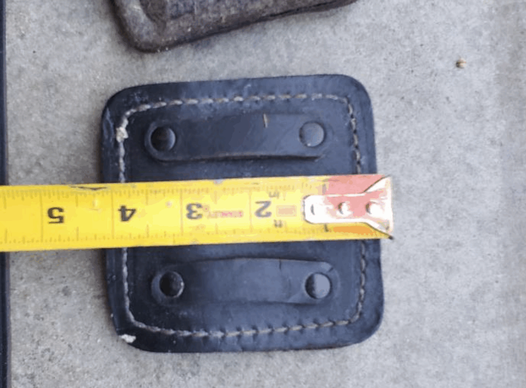 The images below show the measurements of the leg strap, leg strap loop, and calf pad. Images are taken from a New Old Stock (NOS) unit. The calf pad is about 4inches in width and length. The calf pad loops on the back are about .5 inches long. Calf leg strap is about 1.25inches wide. The calf strap loop is about an inch wide. The calf leg strap is about 22inches long.