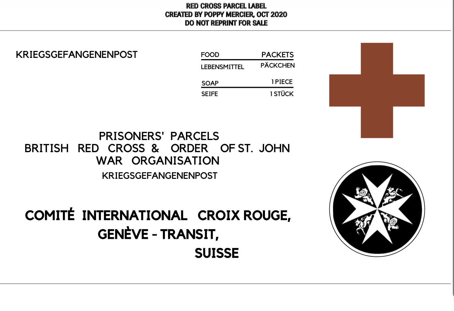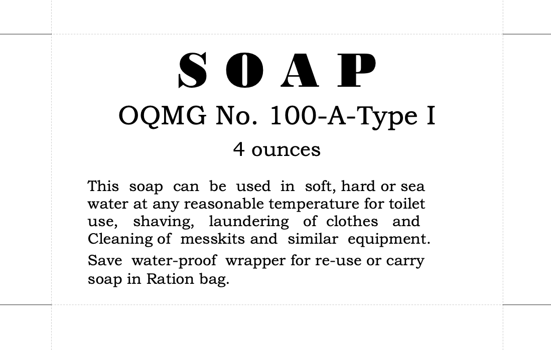 Iron Ration– This was a German ration which appeared to have a unit of bread (Hartkeks) and a unit of meat (Fleischkonserve, Rinderbraten, Truthahnstucke, Schinkenstucke, and maybe Huhnstücke, but I’m unsure). The Fleischkonserve is essentially canned mystery meat. I don’t do German, but I guess some kind of potted meat or canned tuna, etc., type can would work with that label. The Hartkeks’ label goes with some unit of hardtack/crackers. The Halbeiserne Portion label that has both on it would be placed on top. So the meat and crackers are combined in a package, and that label goes on top. I guess the label could be white or the blue and tan colors shown in the colored images.