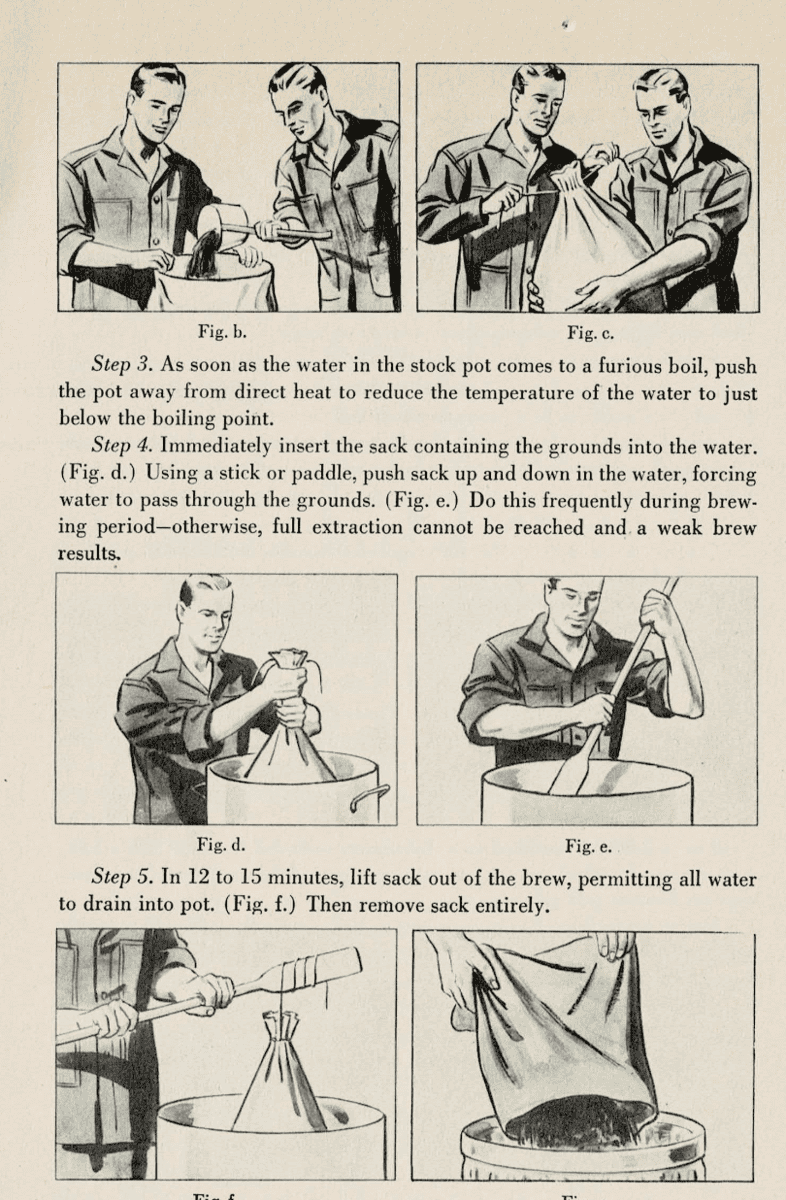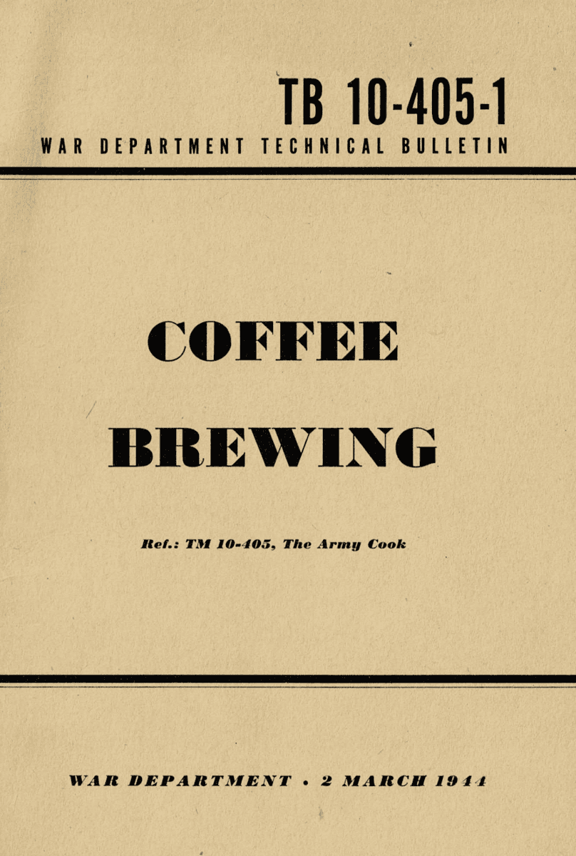 TB 10-405-1 Coffee Brewing, March 1944 – This is a technical bulletin that outlines additional and supplementary instructions on how to make coffee. For a general outline, refer to TM 10-405, the Army Cook.